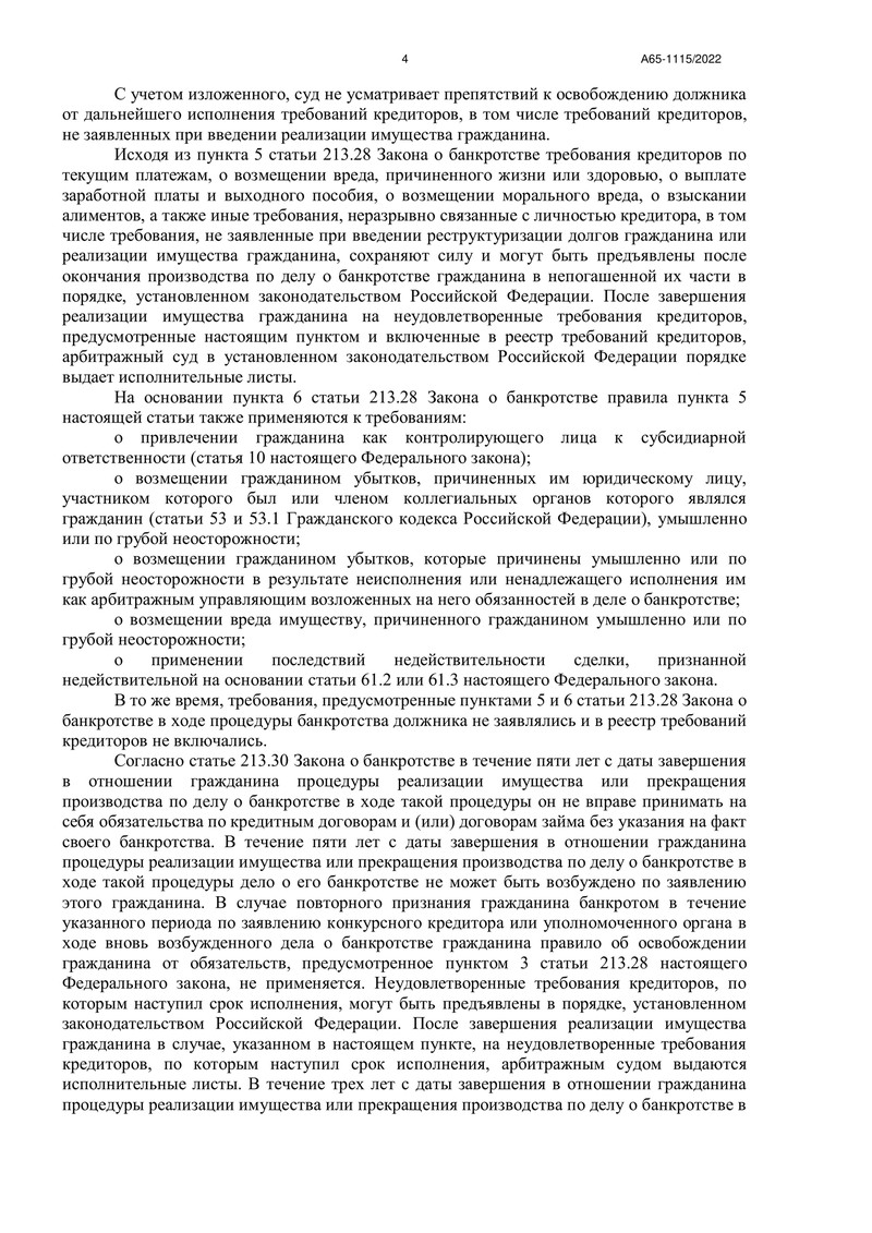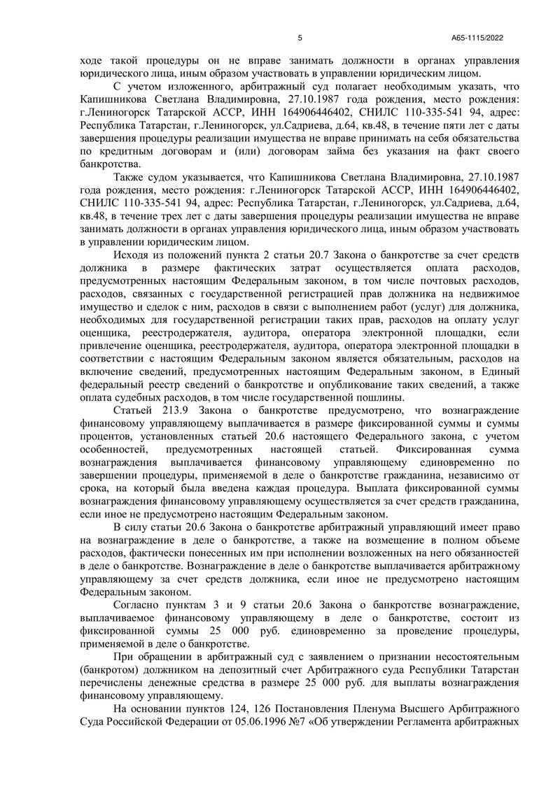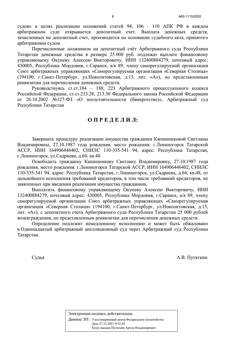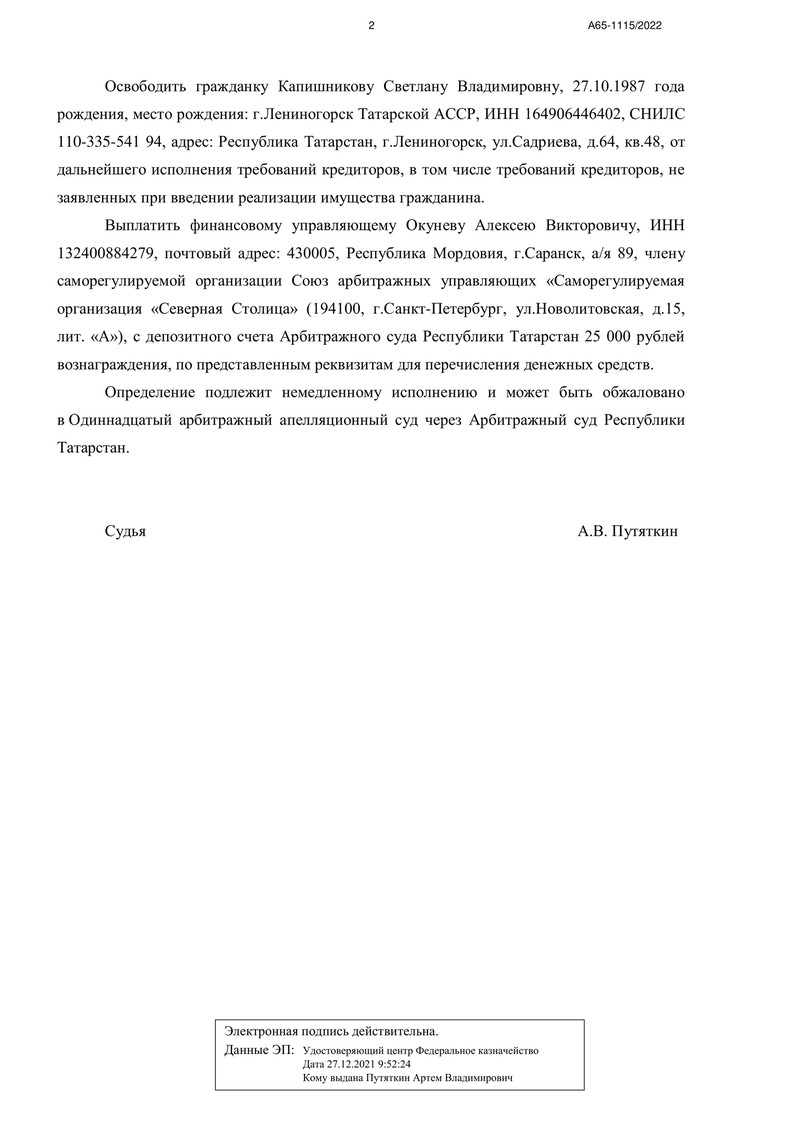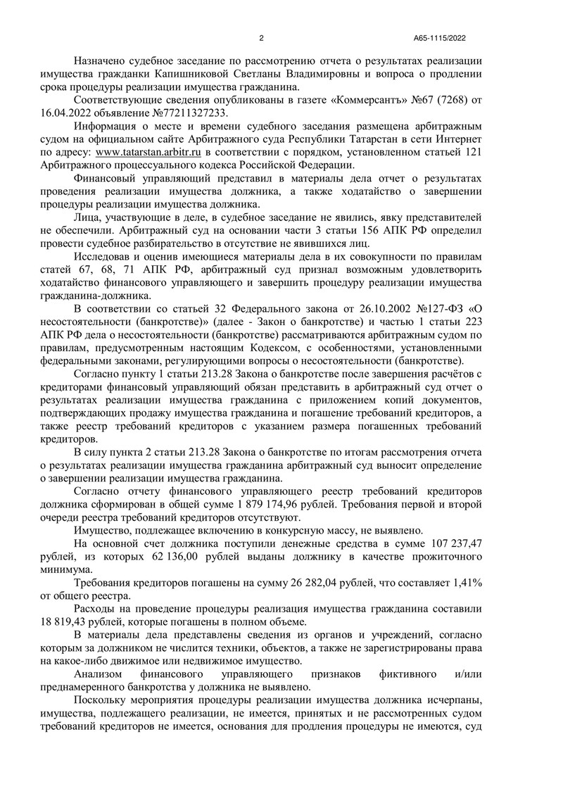 Ситуация была сложной: долги нашего клиента достигли 1 879 174 рублей. Судья, рассматривавший дело № А65-1115/2022, после тщательного анализа документов пришел к выводу, что обязательства клиента перед кредиторами частично погашены, а восстановление его платежеспособности невозможно.