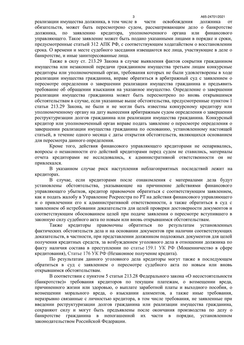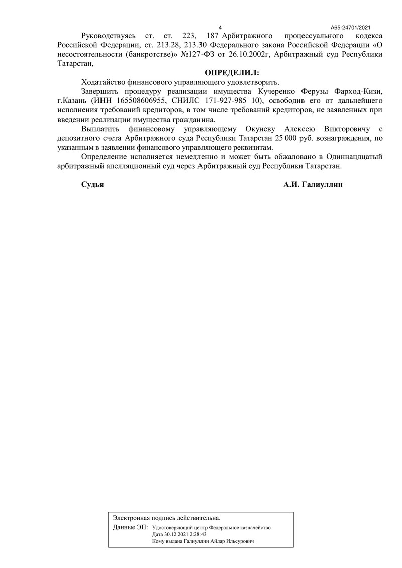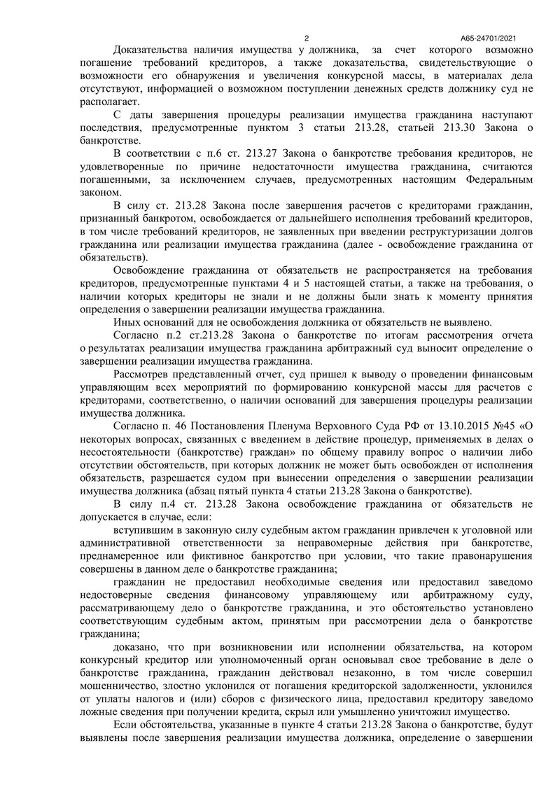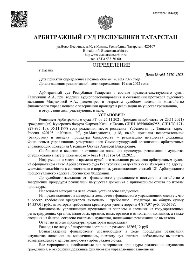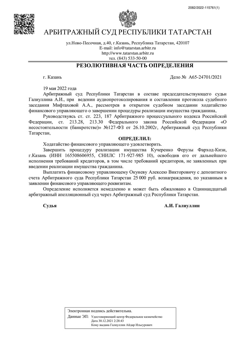 19 мая 2022 года Арбитражный суд Республики Татарстан вынес определение о завершении процедуры реализации имущества и освобождения нашего клиента от дальнейших обязательств перед кредиторами.