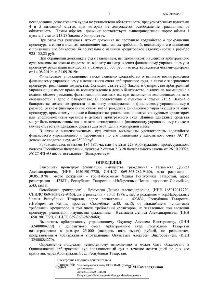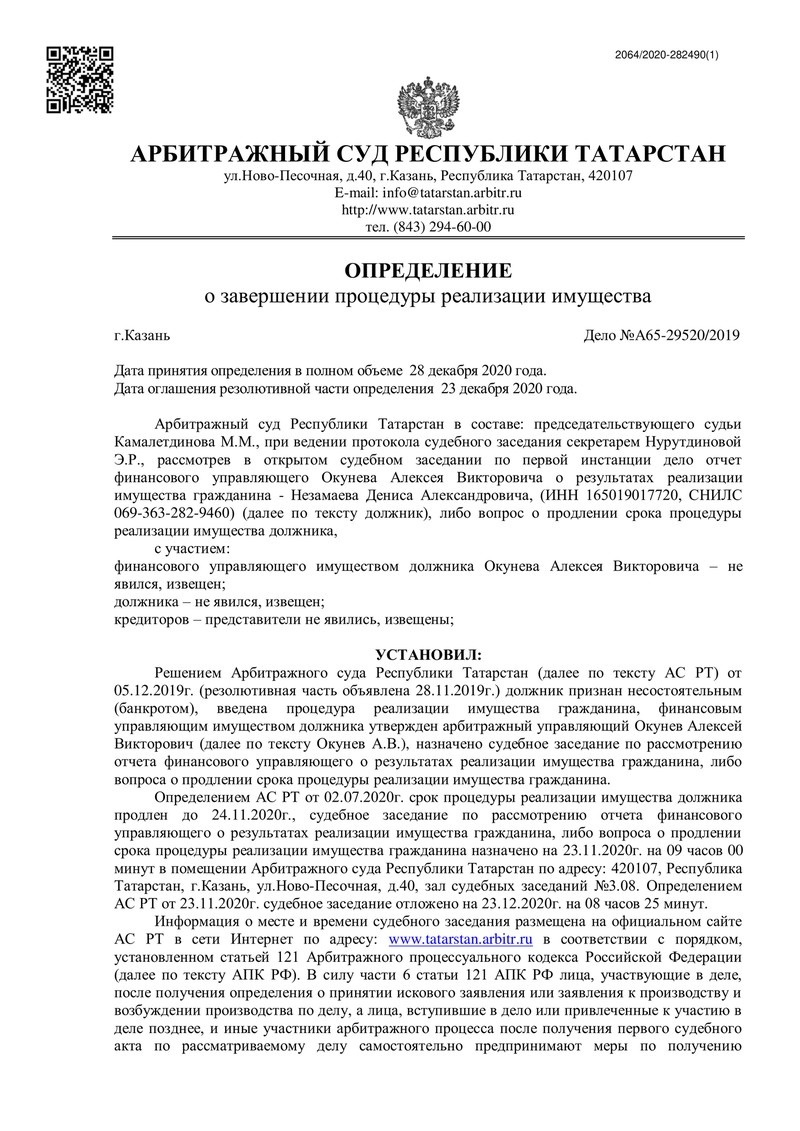 Еще один клиент компании "ДОЛГАМ.НЕТ" успешно завершил процедуру своего банкротства! 28 декабря 2020 года Арбитражный суд Республики Татарстан вынес определение по делу №А65-29520/2019, завершив процедуру реализации имущества гражданина и освободив его от дальнейших обязательств перед кредиторами.