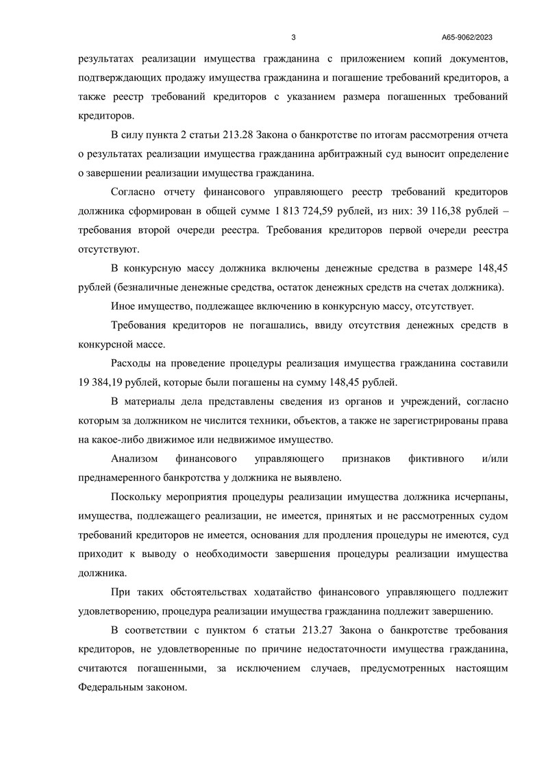 Судом было установлено, что все необходимые мероприятия выполнены, а имущества, подлежащего реализации, не выявлено. В реестр требований кредиторов не были заявлены требования по текущим платежам, возмещению вреда, заработной плате и другим обязательствам.