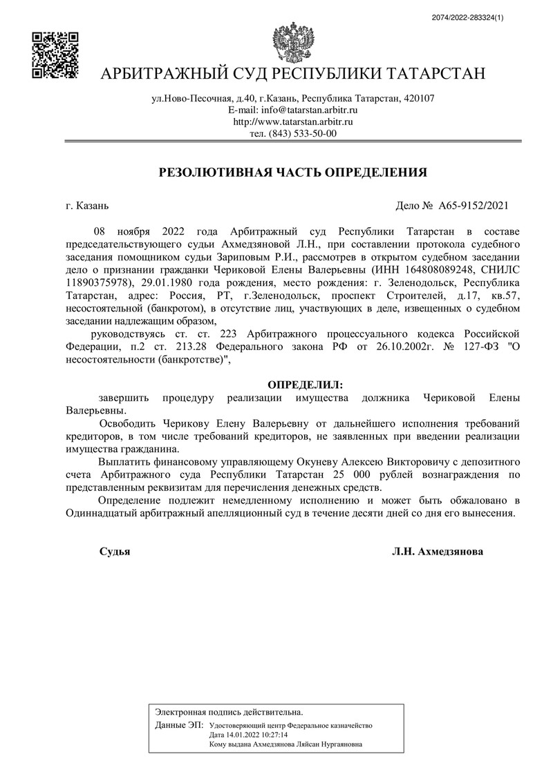 Мы рады сообщить еще об одном успешном деле компании "ДОЛГАМ.НЕТ", которое завершилось в Арбитражном суде Республики Татарстан. Наш клиент был освобожден от своих долговых обязательств, и это очередное подтверждение высокого уровня профессионализма специалистов "ДОЛГАМ.НЕТ".