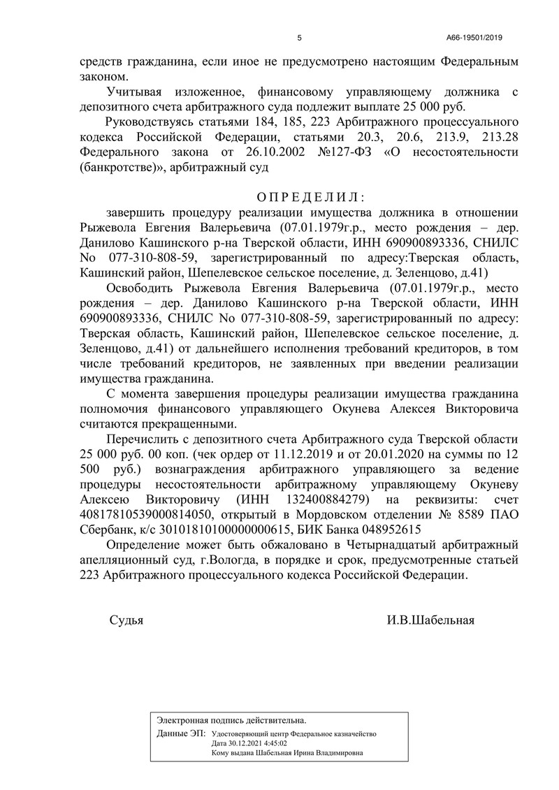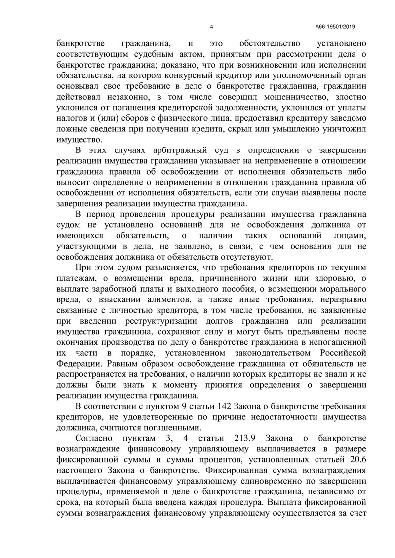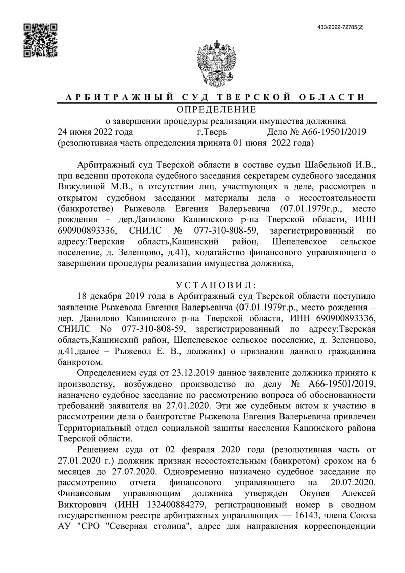 Дело №А66-19501/2019 началось с заявления должника, поданного в декабре 2019 года. У должника не оказалось имущества, достаточно для полного расчета с кредиторами.