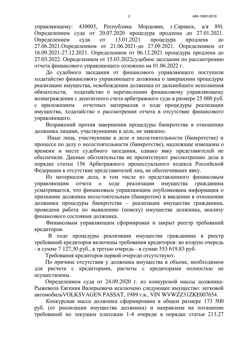 К сожалению, имущество должника состояло лишь из легкового автомобиля Volkswagen Passat, 1989 года выпуска. Конкурсная масса была сформирована в размере 173 500 руб. и была направлена на погашение текущих платежей и частичного удовлетворения требований кредиторов.