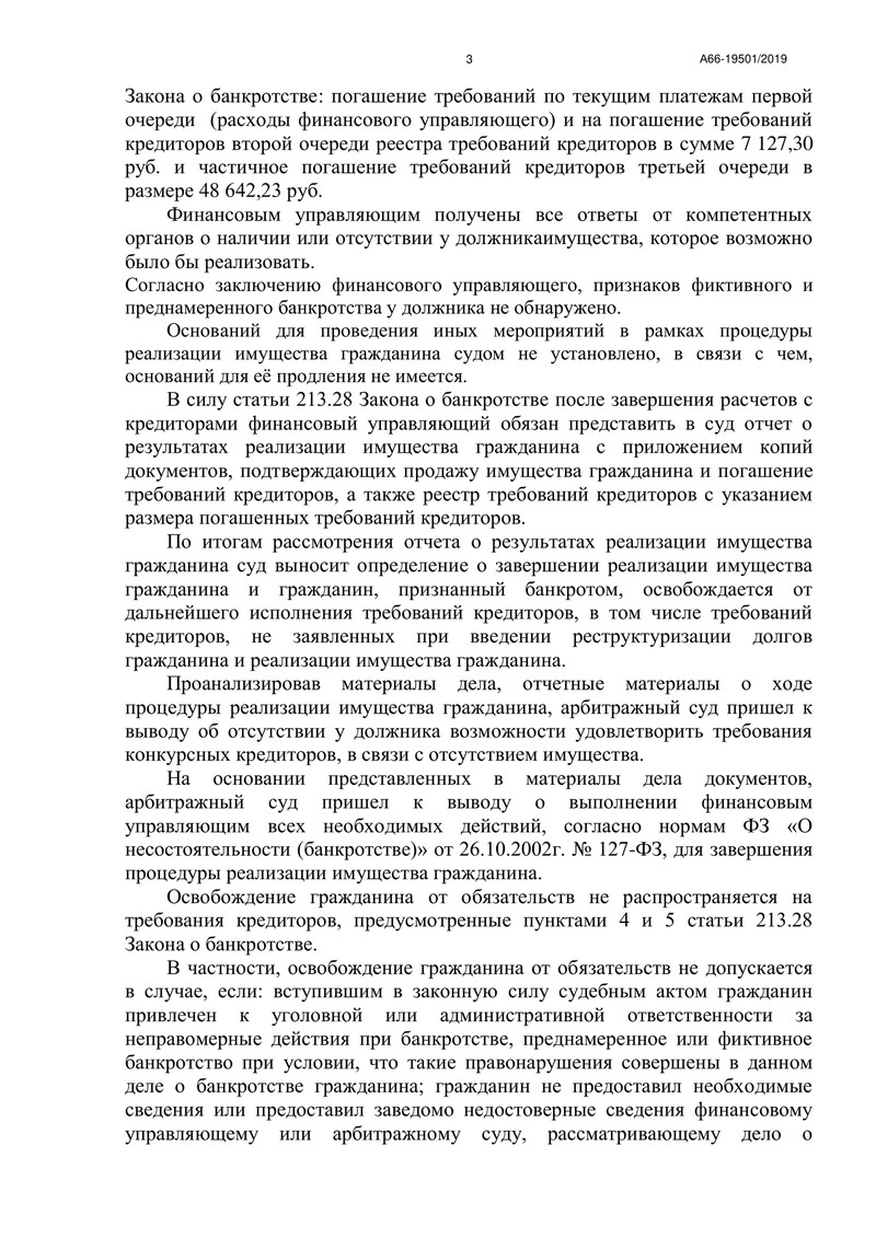 В итоге суд пришел к выводу о том, что все необходимые действия для завершения процедуры реализации имущества были выполнены. Так как у нашего клиента отсутствовало имущество, достаточное для удовлетворения всех требований, на основании Закона о банкротстве, он был освобожден от дальнейшего исполнения обязательств перед кредиторами.