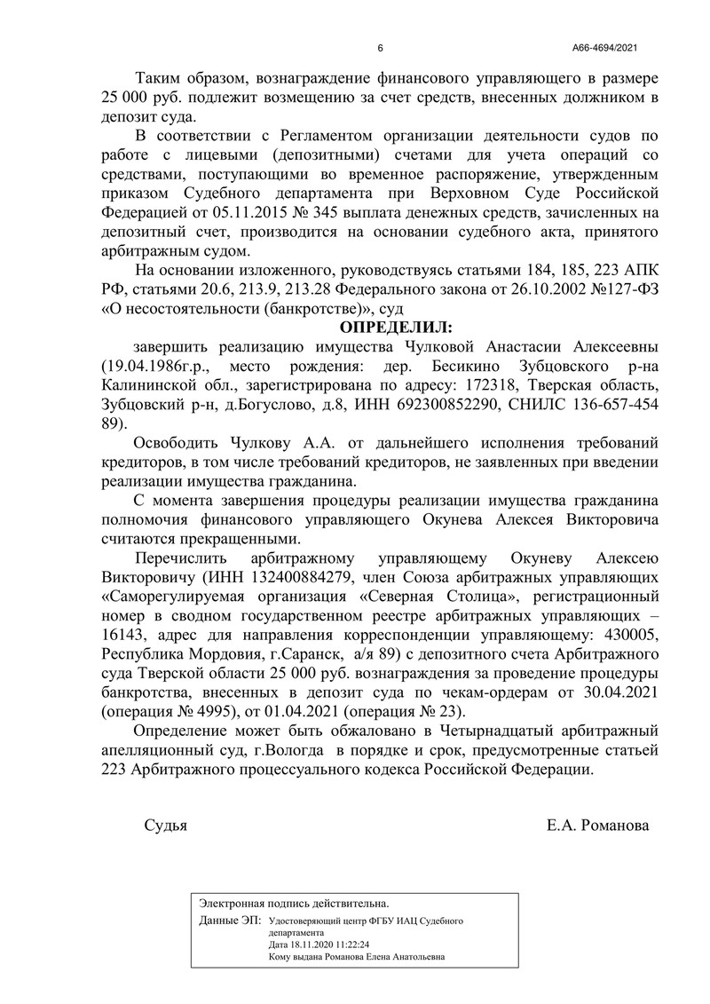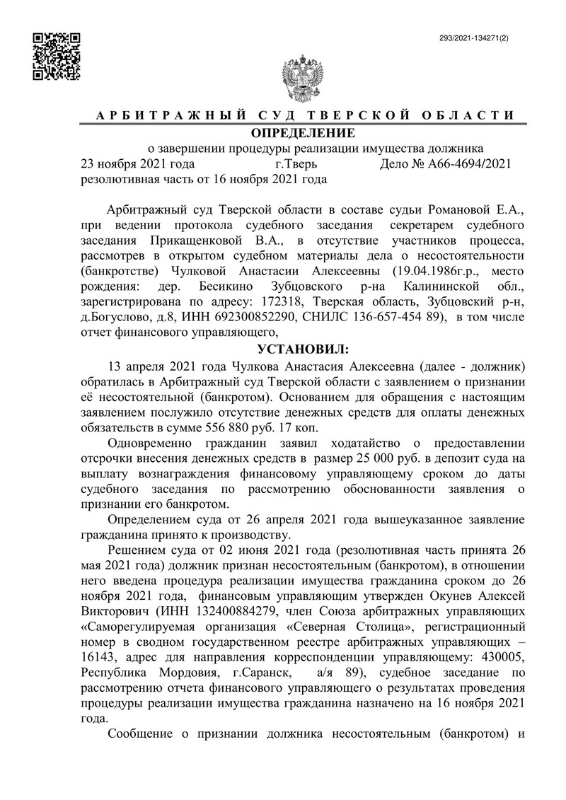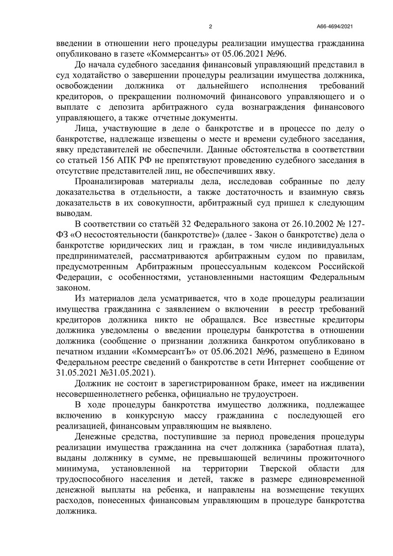 Арбитражный суд Тверской области завершил процедуру реализации имущества нашего клиента 23 ноября 2021 года. Дело №А66-4694/2021 было возбуждено 13 апреля 2021 года, когда должник обратился в суд с заявлением о признании его несостоятельным. Сумма долга составляла 556 880 руб. 17 коп.