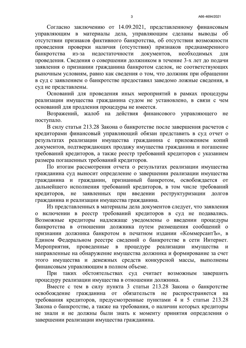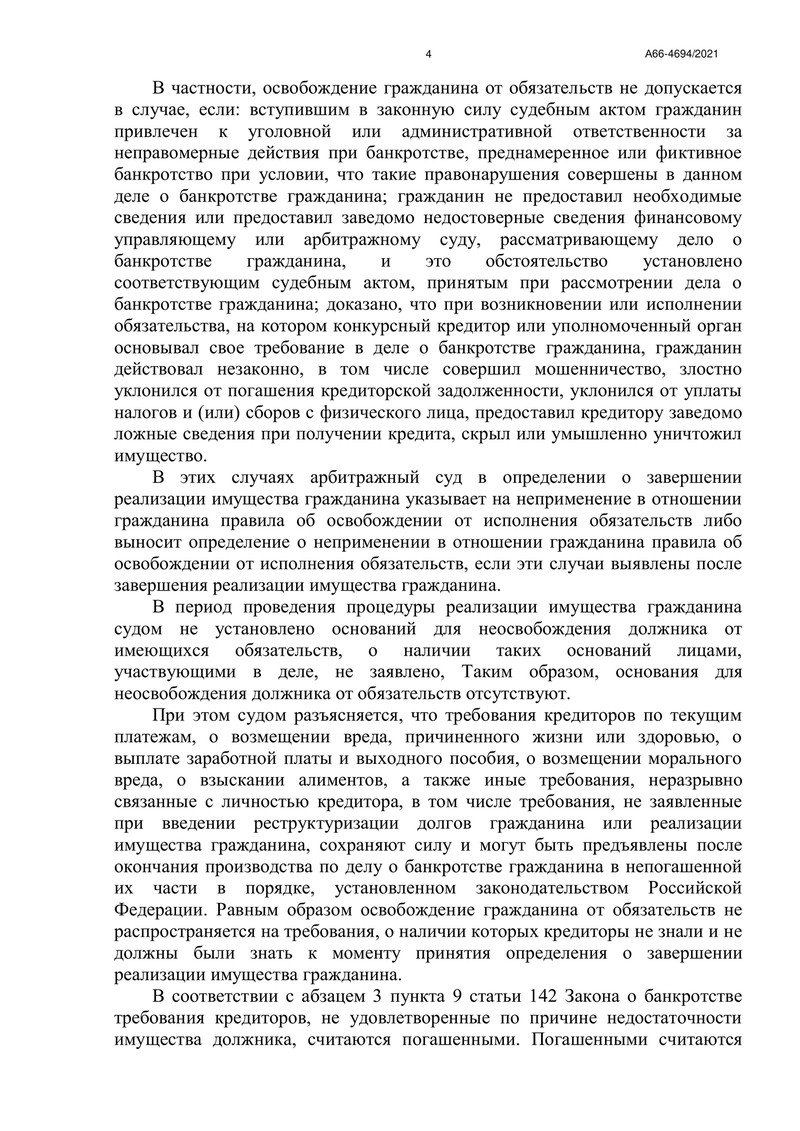 На момент завершения процесса возражений или жалоб на действия финансового управляющего не поступило. Определением суда от 23 ноября 2021 года наш клиент был освобожден от дальнейшего исполнения требований кредиторов. Полномочия финансового управляющего завершены.