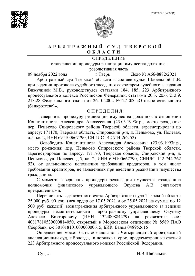 - Арбитражный суд Тверской области признал процедуру реализации имущества должника завершённой.