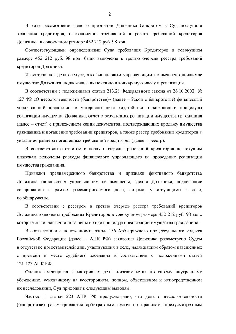 Во время рассмотрения дела в реестр требований кредиторов было включено несколько обязательств, общая сумма которых составила 452 212 рублей 98 копеек. Однако ни движимого, ни недвижимого имущества, подлежащего реализации, выявлено не было, что было зафиксировано в отчете финансового управляющего.