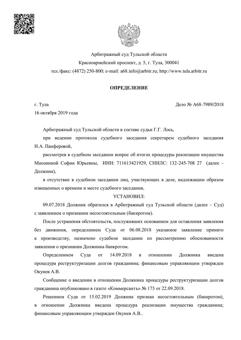 Арбитражный суд Тульской области завершил процедуру реализации имущества клиента компании "ДОЛГАМ.НЕТ". Решение по делу №А68-7989/2018 было вынесено 16 октября 2019 года.