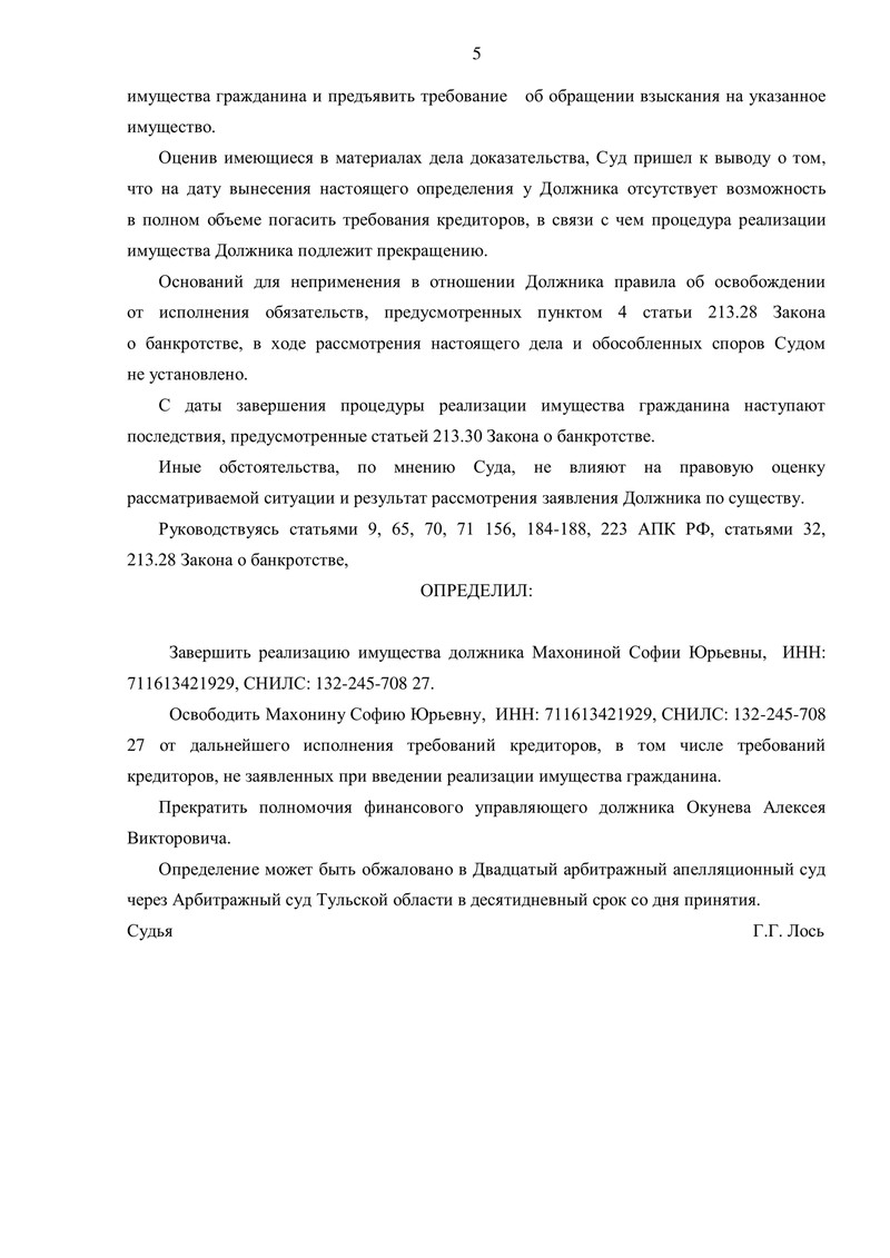 По итогам рассмотрения отчета финансового управляющего было вынесено определение о завершении процедуры реализации имущества должника. Судья констатировал, что на момент вынесения определения у нашего клиента не было возможности в полном объеме погасить требования кредиторов. В соответствии с законом, это стало основанием для прекращения процедуры реализации имущества и освобождения должника от его обязательств.