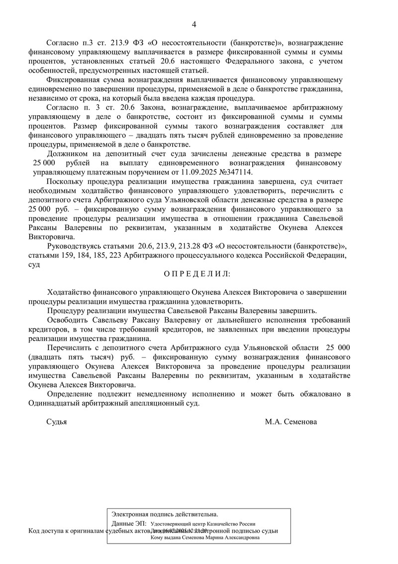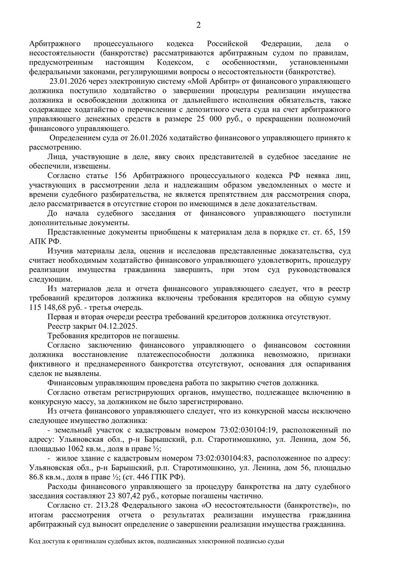 Дело № А72-9334/2025 (Ульяновская область): процедура банкротства завершена, клиент освобожден от долгов