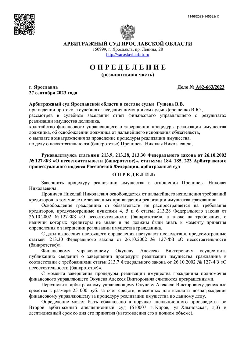 27 сентября 2023 года суд вынес определение о завершении процедуры реализации имущества и освобождении нашего клиента от дальнейшего исполнения требований кредиторов. Таким образом, все долги, не погашенные из-за недостаточности имущества, были списаны. Это стало настоящим облегчением для нашего клиента, который теперь может начать жизнь с чистого листа.