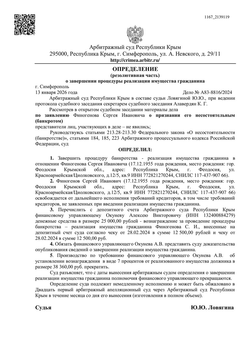Финансовый управляющий в деле — Окунев А.В. Суд определил перечислить ему с депозитного счета Арбитражного суда Республики Крым 25 000,00 руб. фиксированного вознаграждения за проведение процедуры (средства были внесены двумя платежами от 28.02.2024 по 12 500,00 руб.). Также суд обязал финансового управляющего представить доказательства публикации сведений о завершении процедуры — это обязательная формальность, которая закрывает процесс с точки зрения публичности и уведомления заинтересованных лиц.